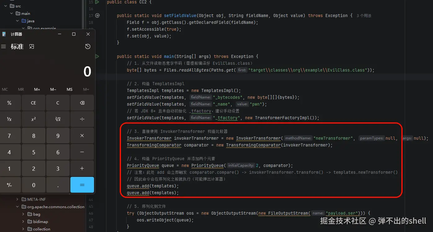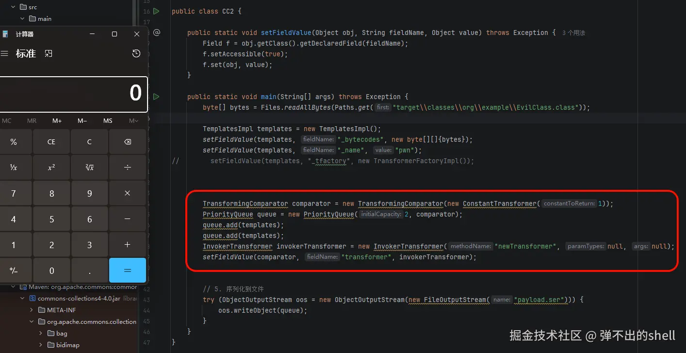 原因是:往 PriorityQueue 里 add() 元素的时候,也会触发堆排序,也就是会调用 comparator.compare()。如果这时候 transformer 已经是 InvokerTransformer,add 阶段就提前触发了一次 RCE,而且这时候第二个元素还没 add 进去,排序逻辑出问题,导致后面反序列化时链跑不起来了。