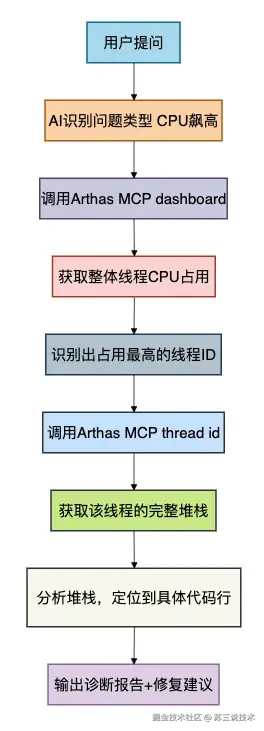 每一步都可能因为不熟悉命令而卡住。现在有了Arthas MCP,你只需要说一句话,AI就帮你把前面9步全做了,而且还会给你解释原因和建议。