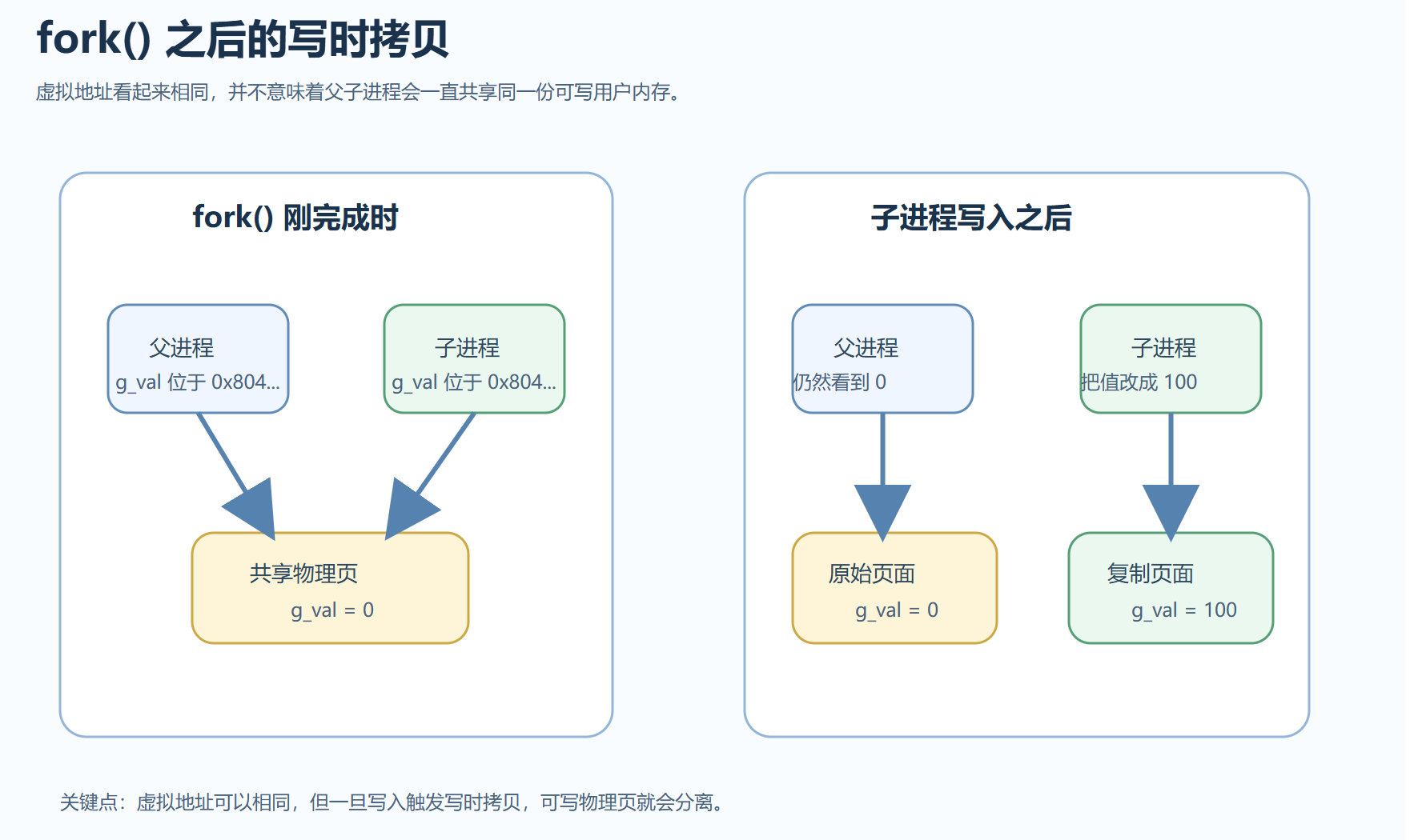 fork()之后,父子进程先共享同一份物理内存页- 只要双方都只是读取,就没有必要立刻复制整块内存