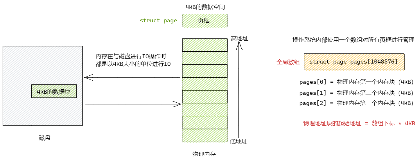 ⼀个32位机器的可⽤的物理内存有4GB的空间,在逻辑上我们可以把物理内存按照4KB⼀个的固定⻓度的页框进⾏分割,每个⻚框包含⼀个物理页(page)。⼀个⻚的⼤⼩等于⻚框的⼤⼩