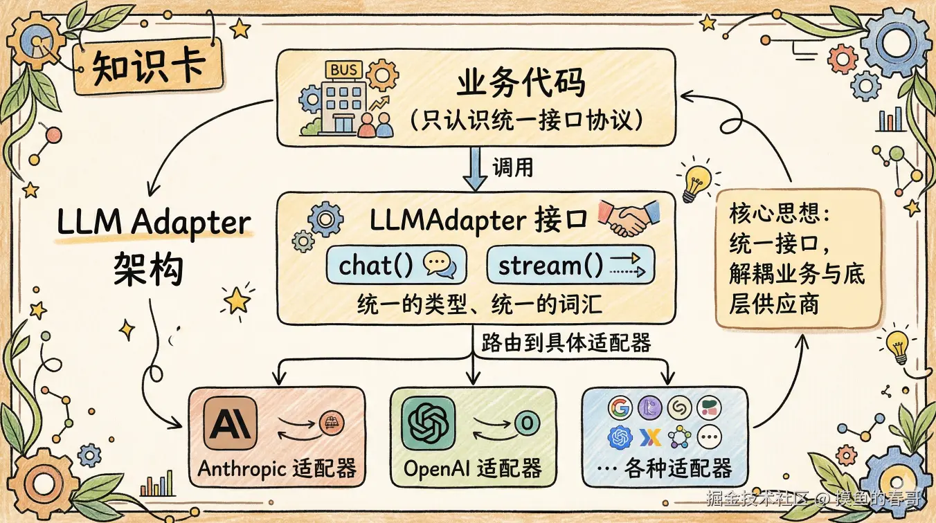 模型厂商的接口差异是表面,本质都是"输入消息,输出 token"。找到这个本质,用适配器模式把差异封装在底层,业务代码就能真正做到"跟厂商解耦"。