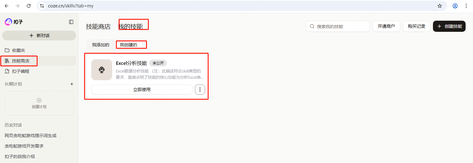 本文选用Coze平台作为Skills实践平台。Coze中会有技能商店,里面的技能属于黑盒。接下来我们自己创建属于自己的Skills。Coze平台提供给我们的是帮助我们编写Skills的Skill。