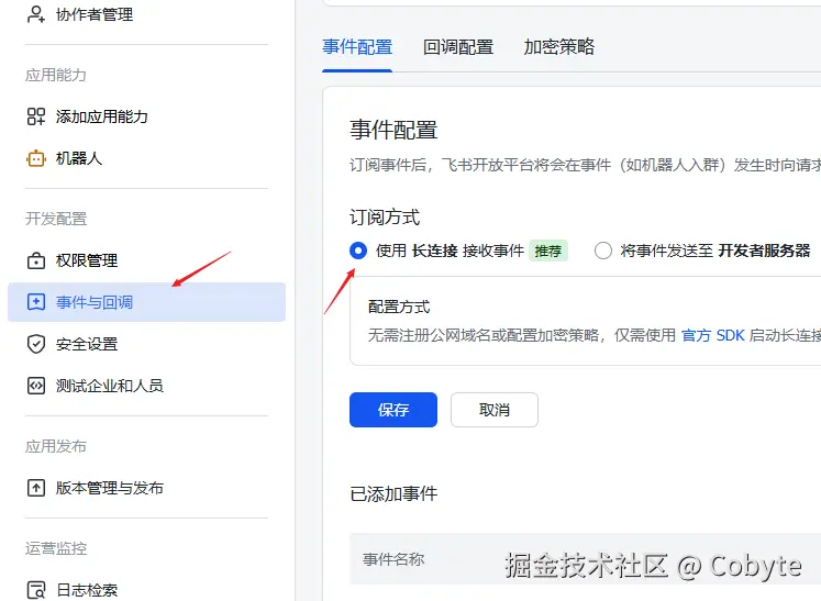 在事件与回调 中进行事件配置 ,选择订阅方式为长连接,这样我们就可以在本地电脑也可以连接飞书机器人了(本质是WebSocket)。