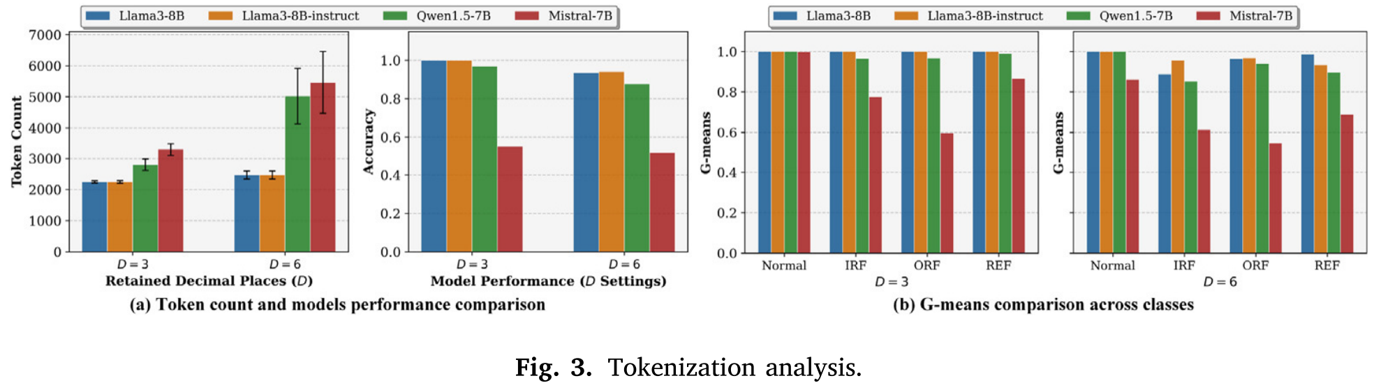 这一编码方式的精妙之处在于:以 D=3 为例,Llama3 的分词器倾向于将 "314,31415" 识别为 "314", ",", "314", "15" 这类紧凑 token,而非逐字符拆分。 这使得 Llama3 模型能以远少于 Qwen1.5 和 Mistral 的 token 数完成信号表示,进而取得更好的诊断性能。
