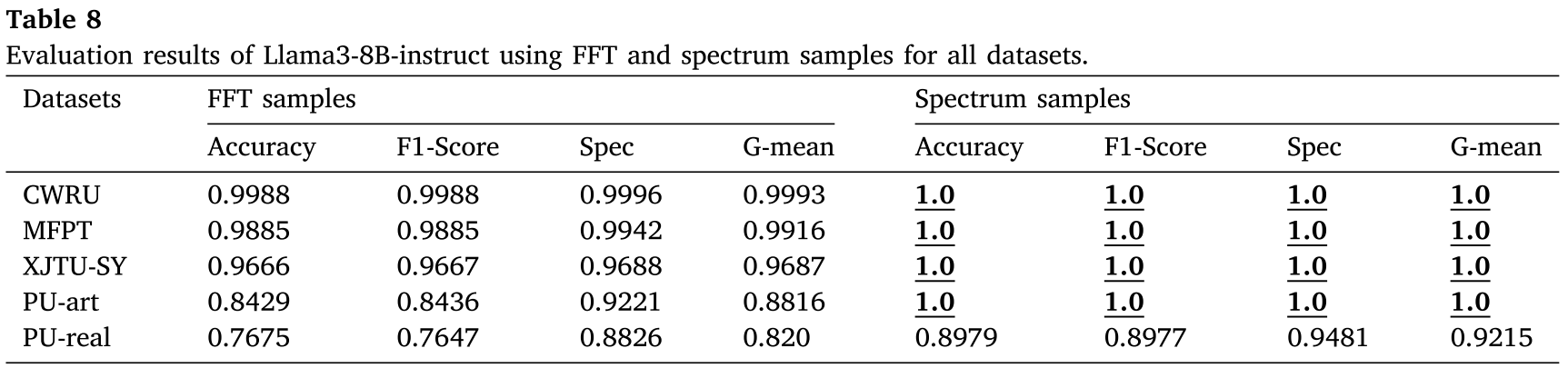 FFT 特征输入 :情况发生了戏剧性转变。Llama3-8B 和 Llama3-8B-Instruct 在 CWRUfft-DE 上分别达到 99.7% 和 99.8% 的准确率,在 CWRUfft-FE 上也分别达到 98.75% 和 99.75%,与专为数值输入设计的 WDCNN(CWRUfft-FE:99.16%)和 1DCNN-SeNet(100%)相当甚至超越。Qwen1.5 和 Mistral 在 FFT 输入下依然表现不佳。