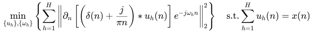 VMD 的数学优化目标为最小化各模态带宽之和,同时约束所有模态之和等于原始信号: