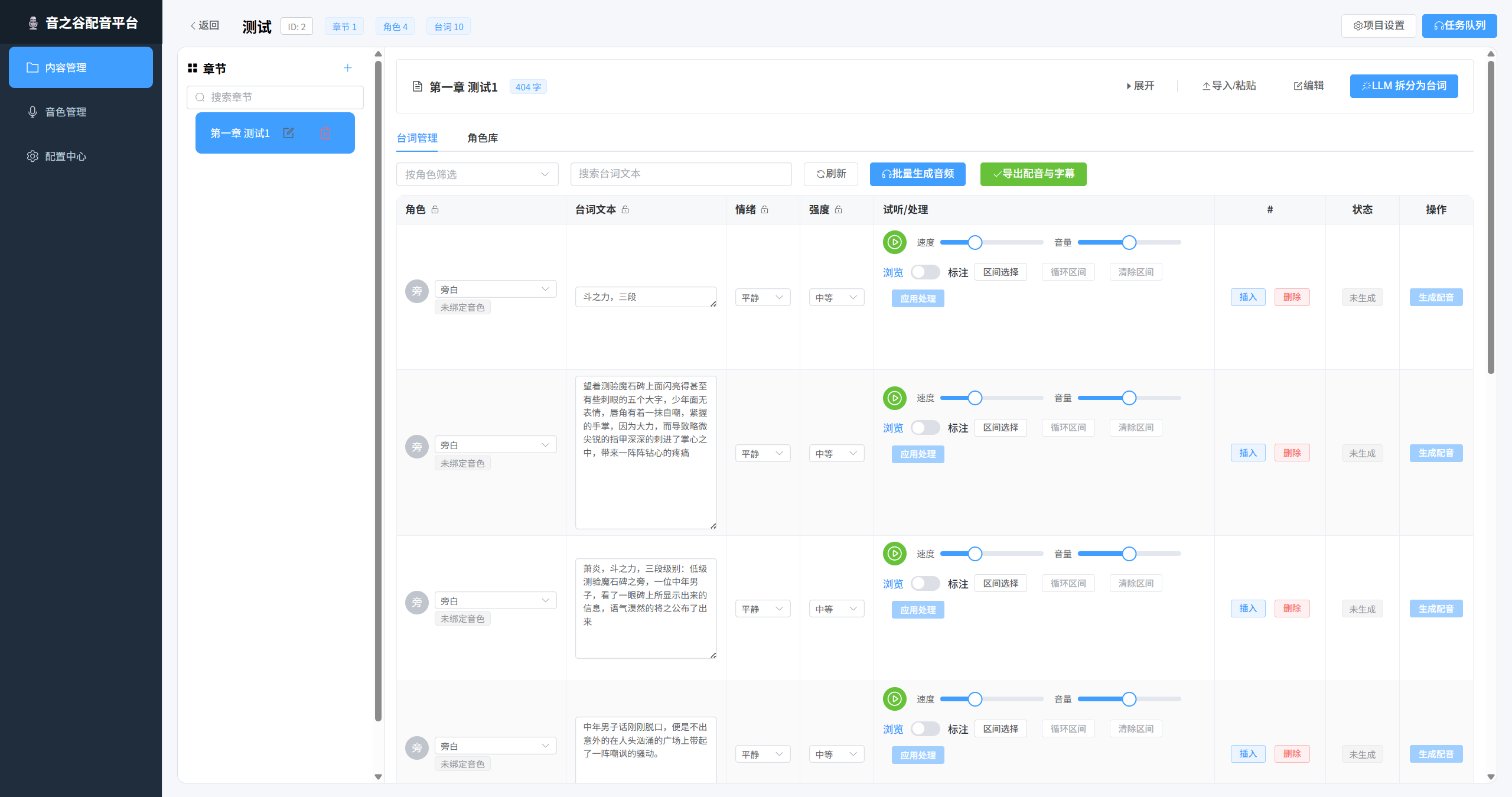 - 台词自动拆分与配音生成