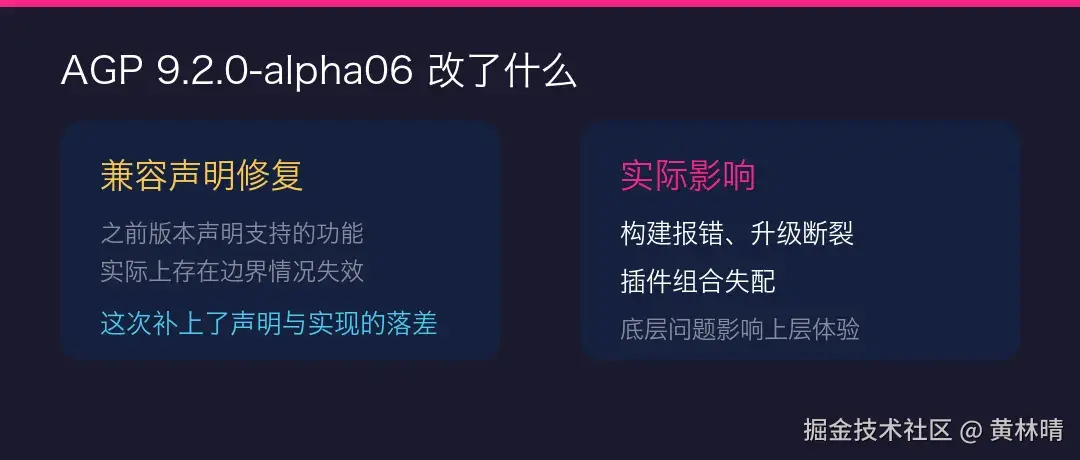 翻译成人话就是:之前某些 AGP 版本声明支持的功能,实际上没完全支持,这次补上了。 听起来小事,但踩到的团队会遇到莫名其妙的构建失败。