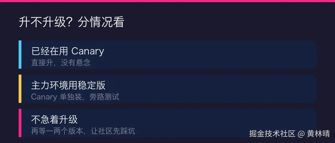 不急着升级的人:再等一两个 Canary 版本,让社区先踩踩坑。