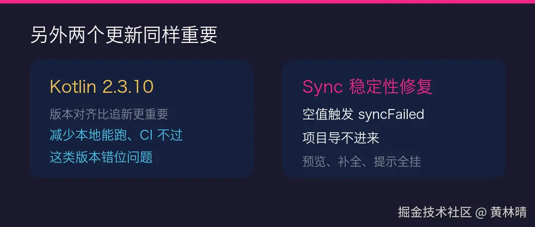 如果你还在用旧版 Kotlin,这次升上去最大的好处是减少版本错位------本地 CI 跑不一样、团队成员机器跑不一样,这种问题一旦出现排查起来很费时间。