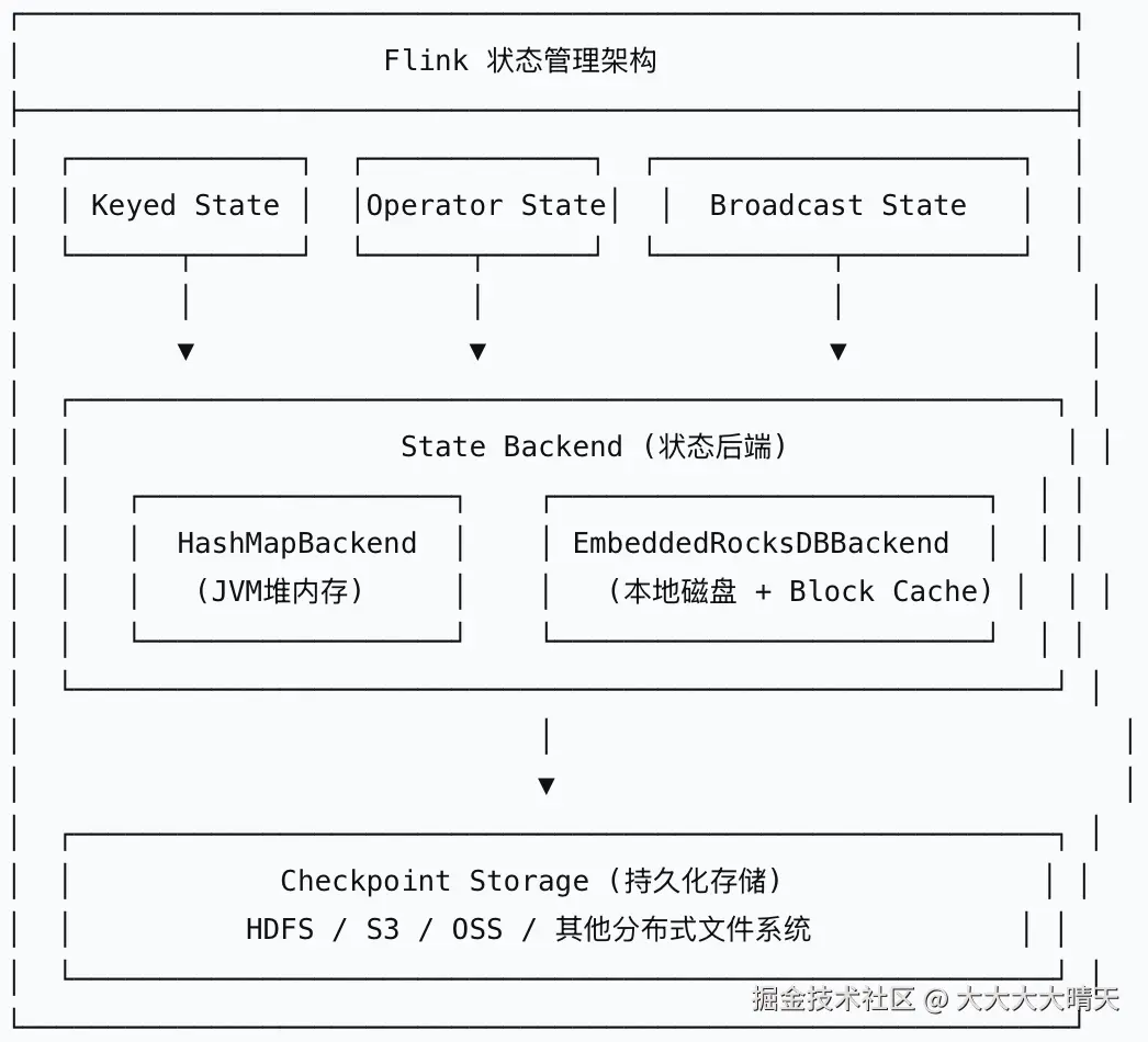 状态后端(State Backend)是Flink内部管理状态的底层存储引擎,负责状态的序列化与反序列化、本地存储、Checkpoint生成与恢复,以及与外部持久化系统的交互。