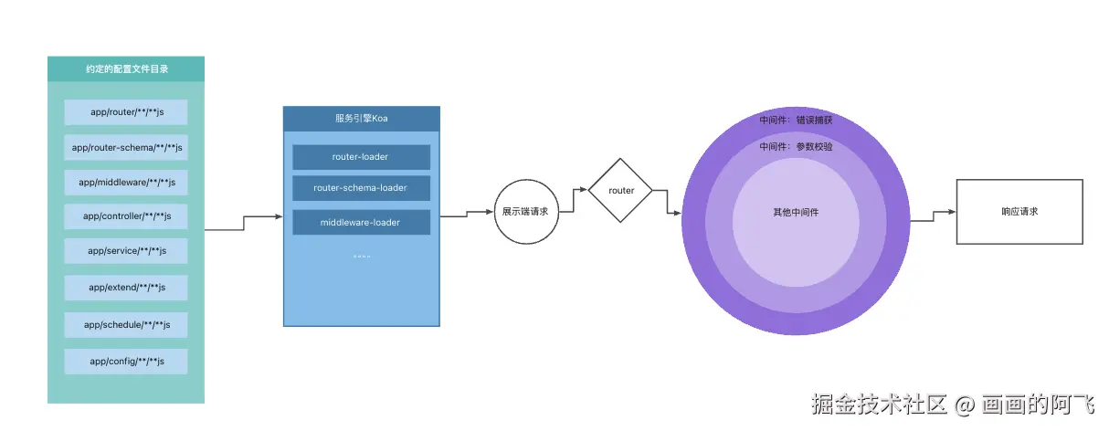 本次学习主要是了解 elpis-core 内核的实现方式,以及封装思路: 定义每一个块业务逻辑的 loader 将业务逻辑加载进来,再经过 层层 "洋葱圈"模型的中间件(接口校验、接口参数校验,页面校验...),再到每个 controller (获取日志信息、读写 mysql...)业务处理后,再响应请求结果。