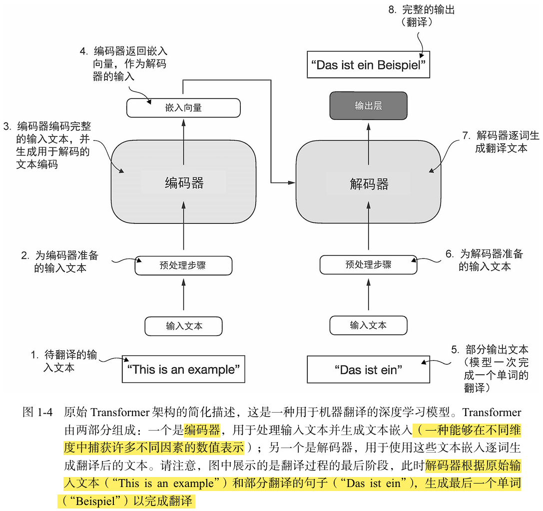 以翻译任务为例,编码器将源语言的文本编码成向量,解码器则解码这些向量以生成目标语言的文本。编码器和解码器都是由多层组成,这些层通过自注意力机制连接。关于如何对输入进行预处理和编码,我们将在后续章节中逐步解答。