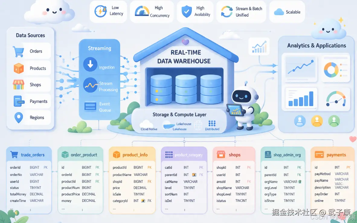 - 场景:企业需要构建实时数据仓库,处理流式数据并支持低延迟分析决策