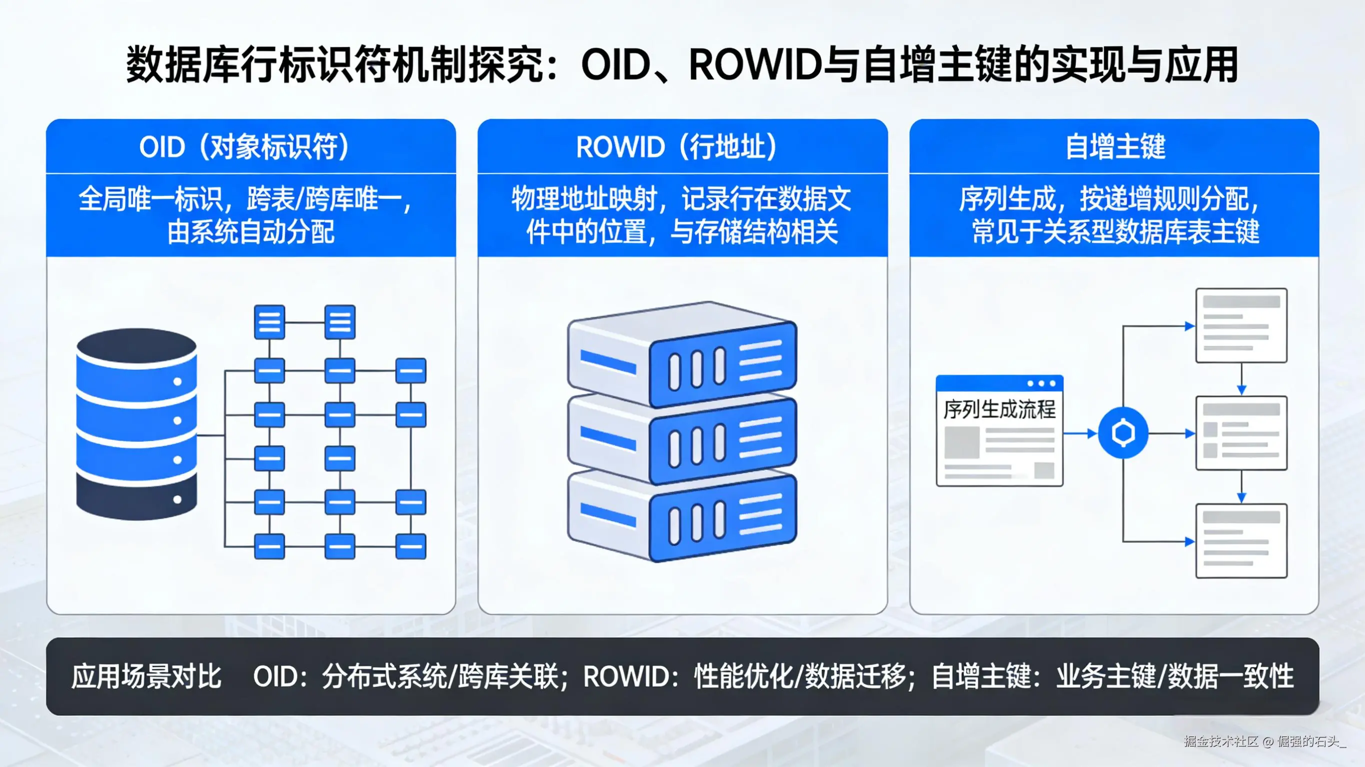 | 推荐用途 | 系统内部管理,元数据查询 | 高效行访问,内部行引用 | 用户表业务主键,提供稳定可靠的行标识 |