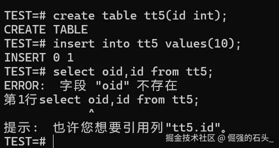 从上边这个例子咱们就能看出来,直接去查tt5表的oid列会报错,这说明这列压根儿就不存在。
