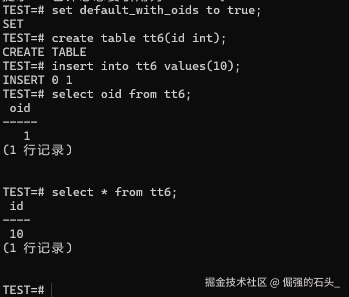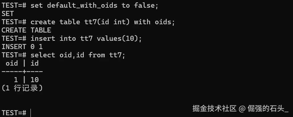 哪怕default_with_oids是false,用WITH OIDS这个子句照样可以给指定的表配上OID。