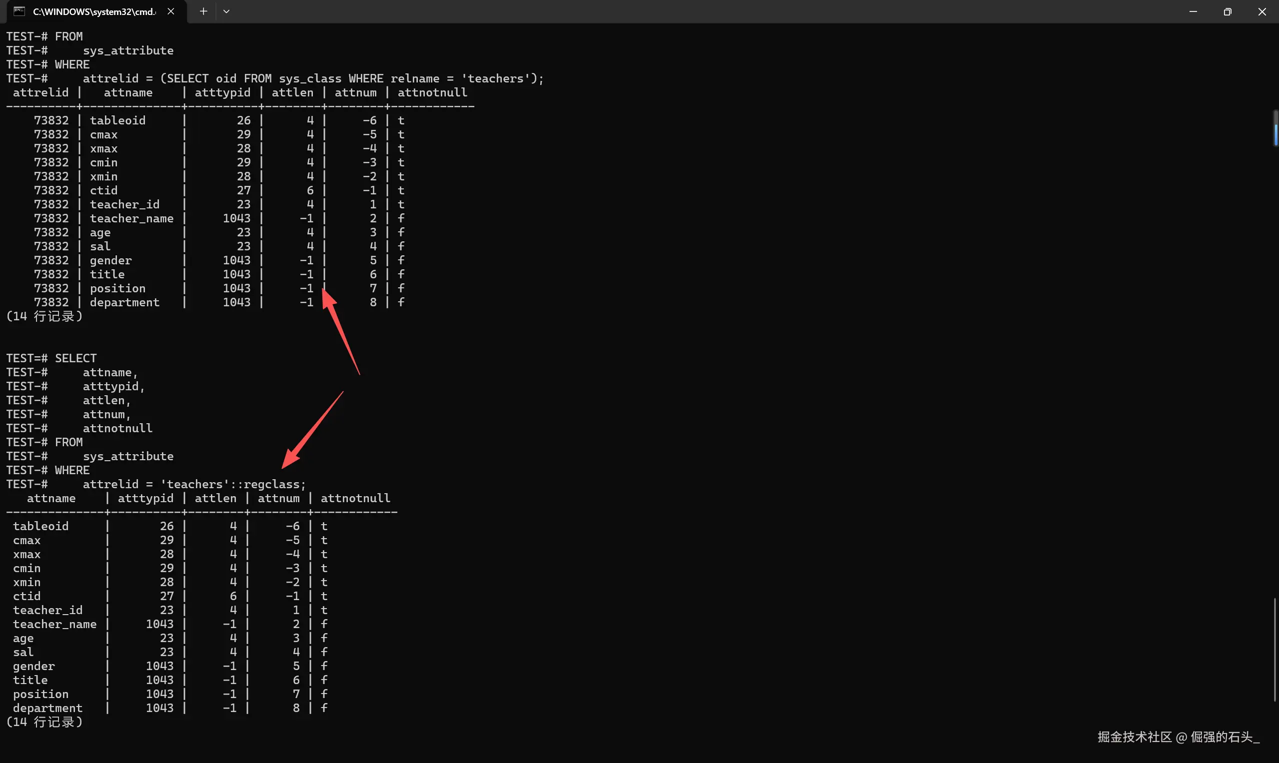 这里的'teachers'::regclass实际上等同于SELECT oid FROM sys_class WHERE relname='teachers',它返回了teachers表的OID,从而实现了更简洁的元数据查询。