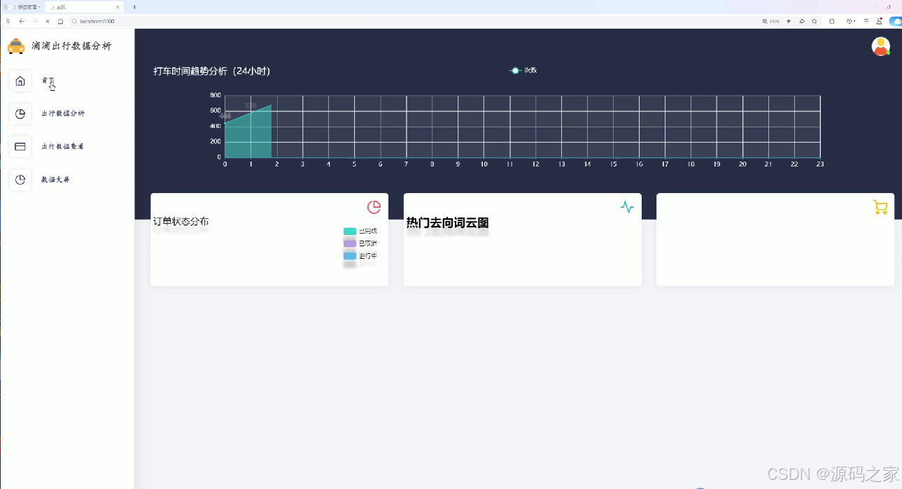 作为平台的核心展示入口,页面左侧配置功能导航栏,支持快速跳转至数据分析、数据查看、数据大屏等子模块。主区域通过环形图展示订单状态分布,词云图呈现热门去向地点,饼图统计出租车类型占比,配合时间轴与主题插画,直观展现出行数据的整体概貌与关键特征。