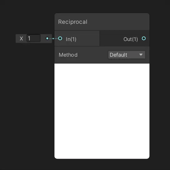 Reciprocal 节点的核心功能是计算输入值的倒数,即输出值等于 1 除以输入值。在数学上,这表示为 f(x) = 1/x。这个简单的数学运算在图形编程中有着广泛的应用,从基本的颜色调整到复杂的光照模型都能见到它的身影。
