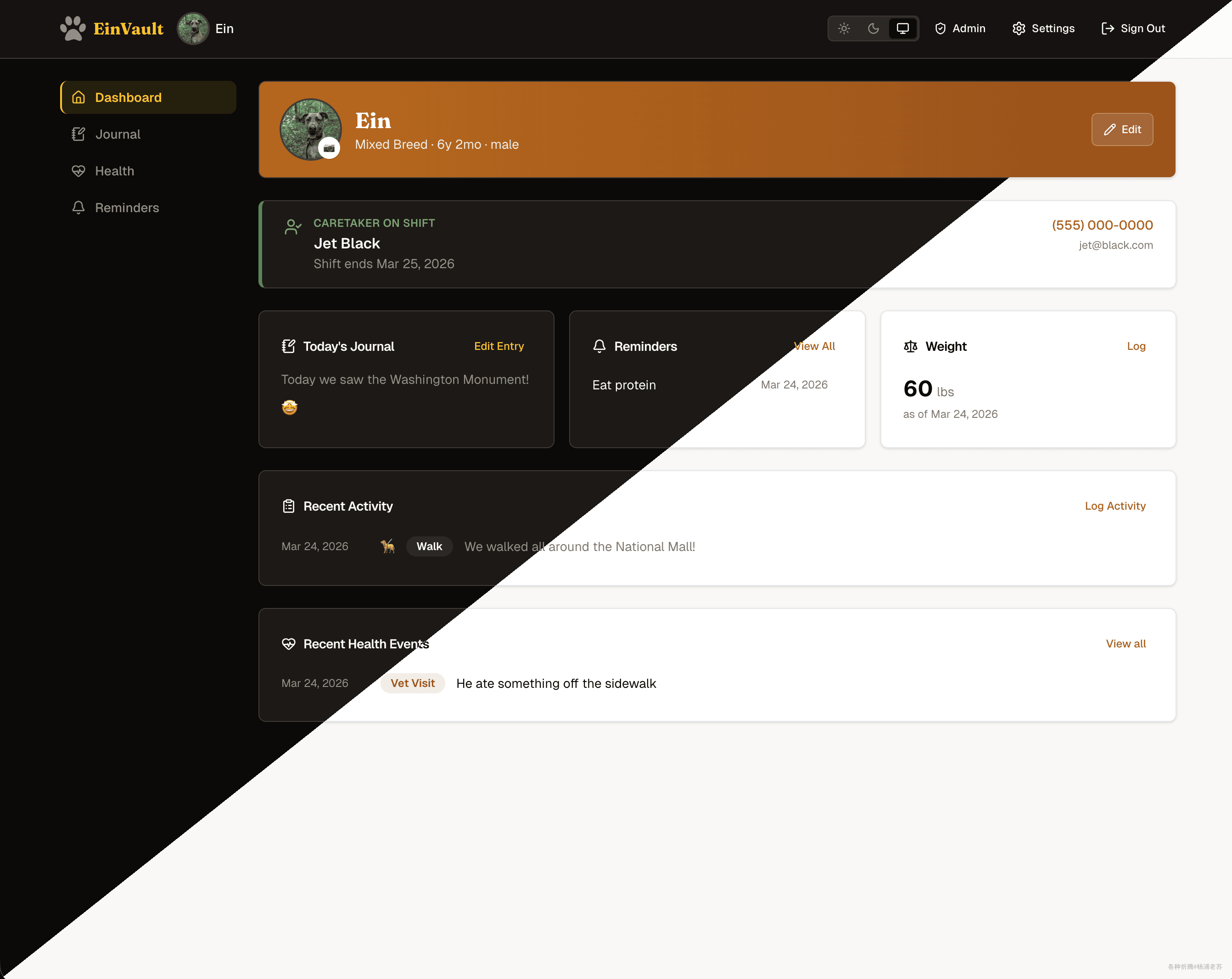 EinVault是一个专为homelabs设计的开源的宠物健康和护理追踪器。它可以帮助用户记录宠物的健康档案、每日活动、护理日程,所有数据都保存在本地硬件上,不依赖云服务,无需注册外部账号。