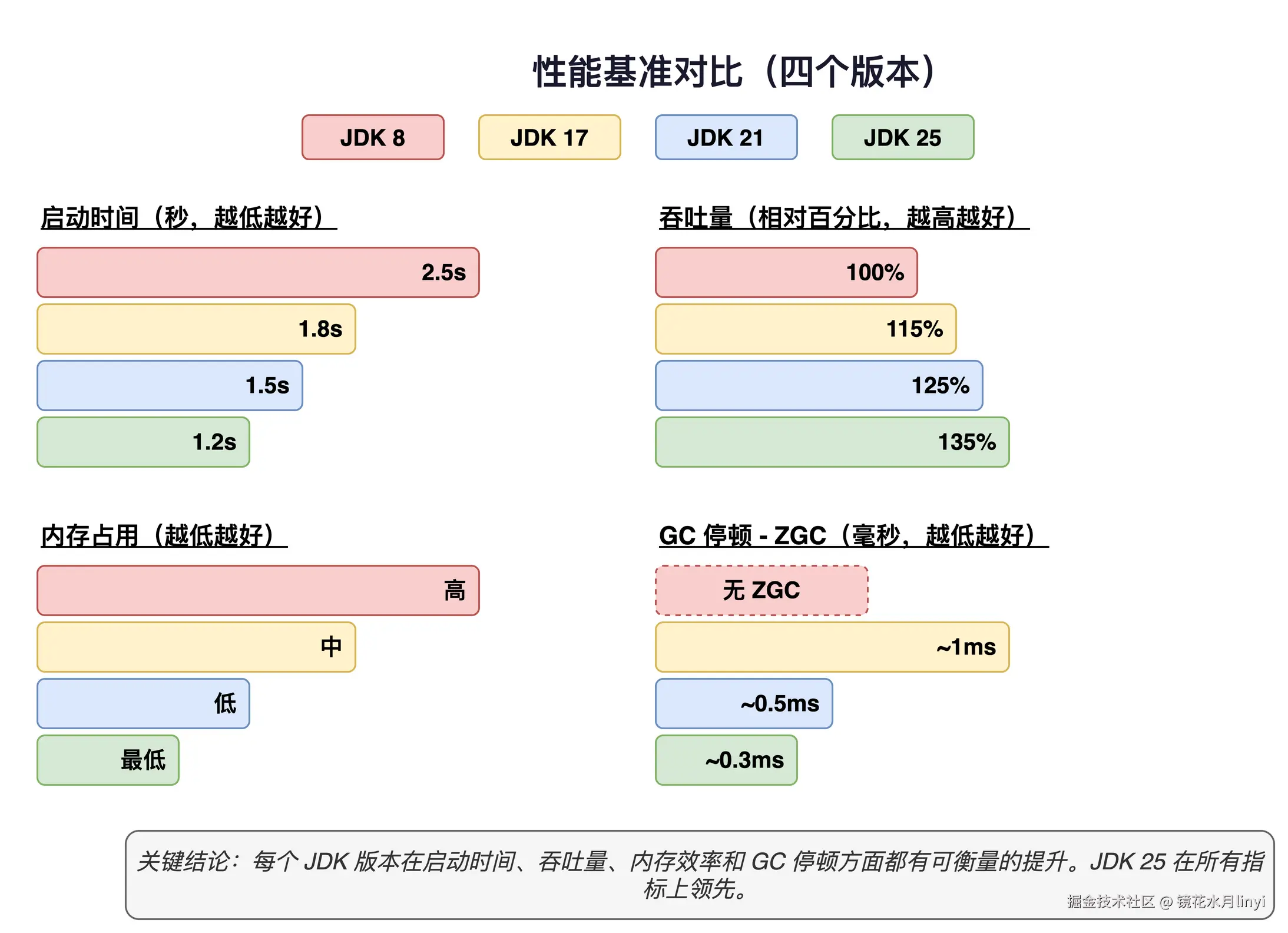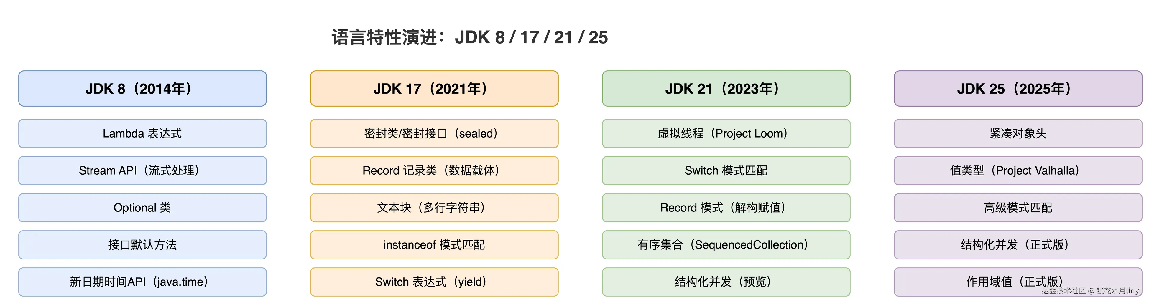 前言 这篇文章是我在开发中经历了从 JDK 8 一路升级到 JDK 25 之后的技术总结。文章覆盖四个 LTS 版本------JDK 8(2014)、JDK 17(2021)、JDK 21(2023)、JDK 25(2025),横跨 11 年的 Java 演进历程。 我不打算列一堆 feature list 然后草草了事。每个版本我都会给出真实的代码示例、JVM 内部机制分析、GC 调优参数。如果你正在考虑版本升级,或者想深入理解 Java 平台这十年来到底发生了什么本质性的变化,这篇文章应该能帮到你。