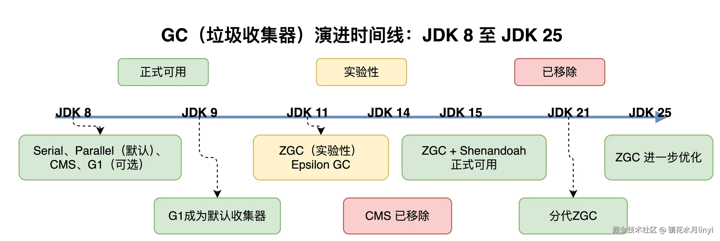 - LTS 节奏:最初是每 3 年一个 LTS(8 → 11 → 17),从 JDK 17 开始改为每 2 年(17 → 21 → 25)