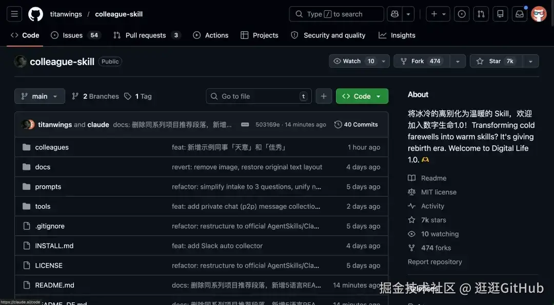 五天时间,7K 多 Star,还在疯涨。项目名叫 colleague-skill,翻译过来就是同事 SKill。