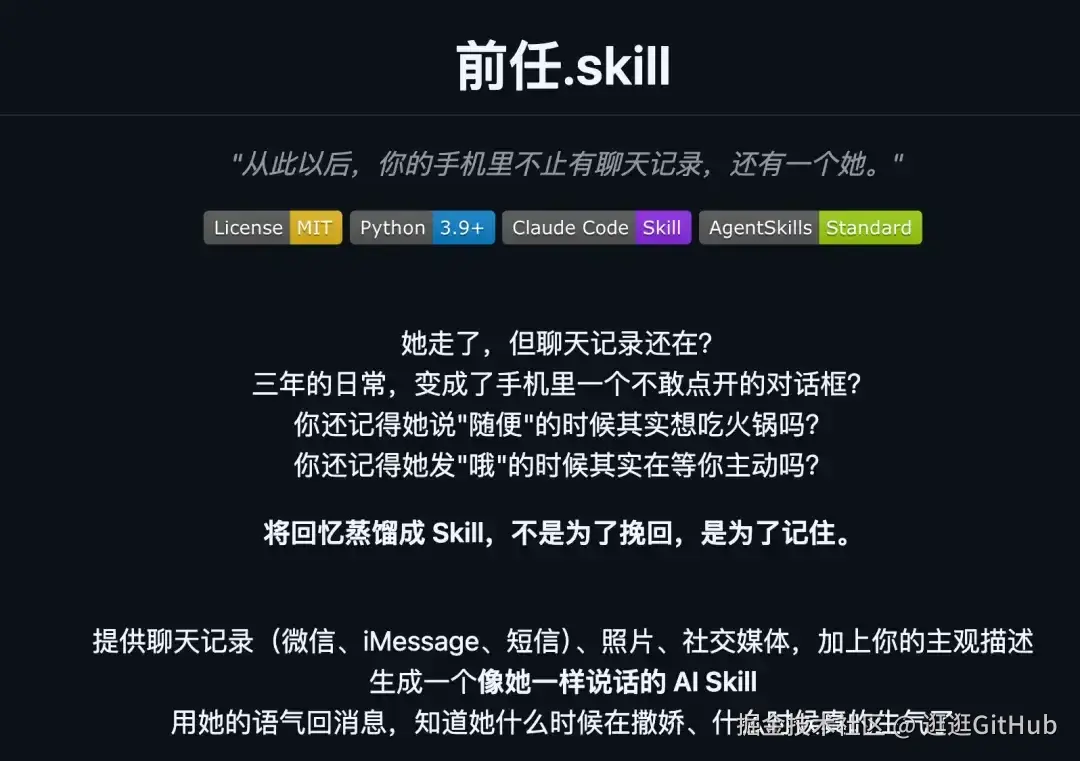 这个项目火了之后,作者又搞了一个前任.skill,把同样的技术用到恋爱关系上。