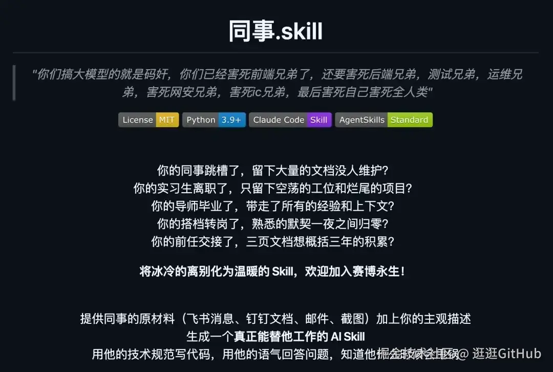 它的核心功能就是把离职同事的工作能力、技术经验、沟通风格甚至性格,全部蒸馏成一个可以独立运行的 AI Skill。
