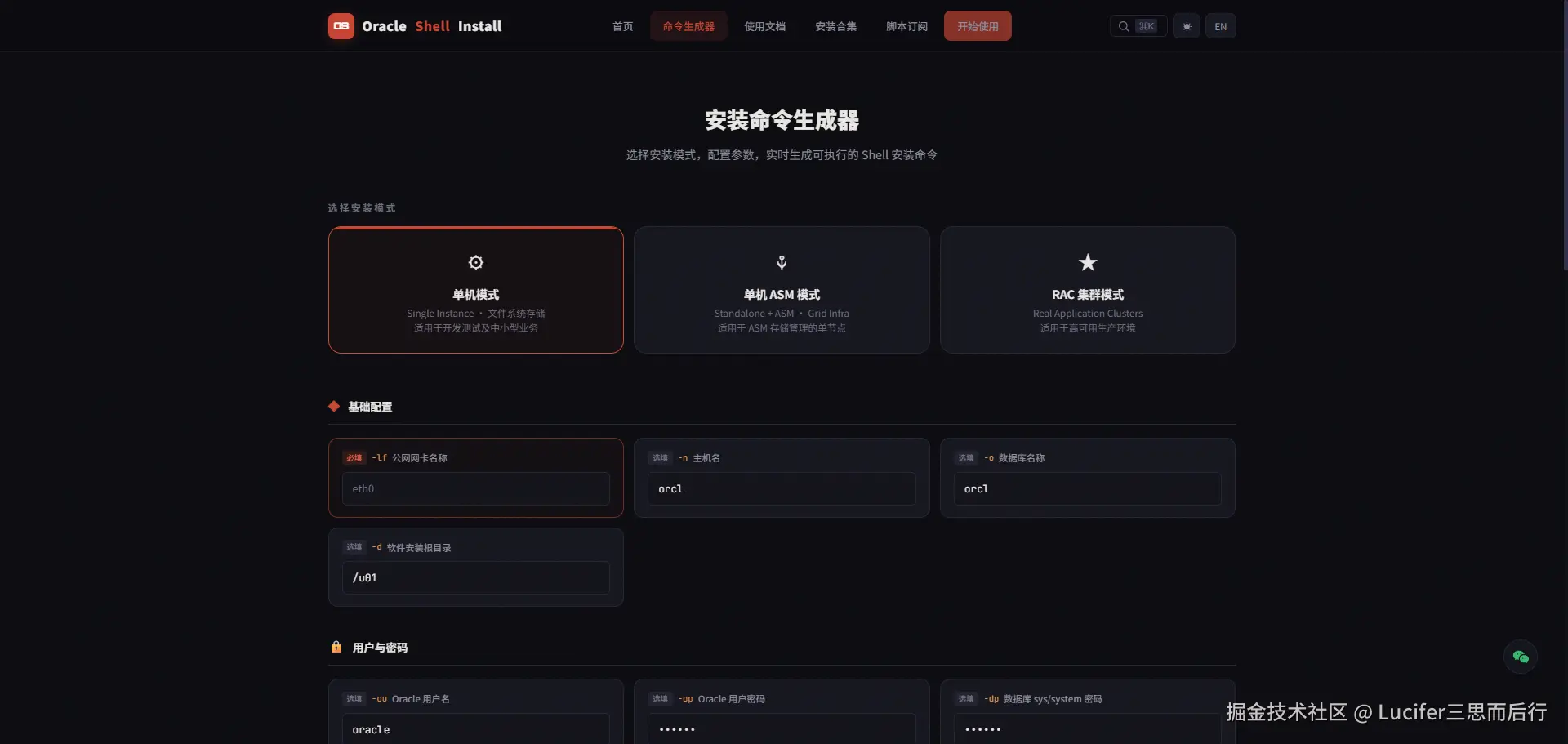 很多人看到命令行就头疼,担心参数记不住、写错。OracleShellInstall 提供了一个在线命令生成器: