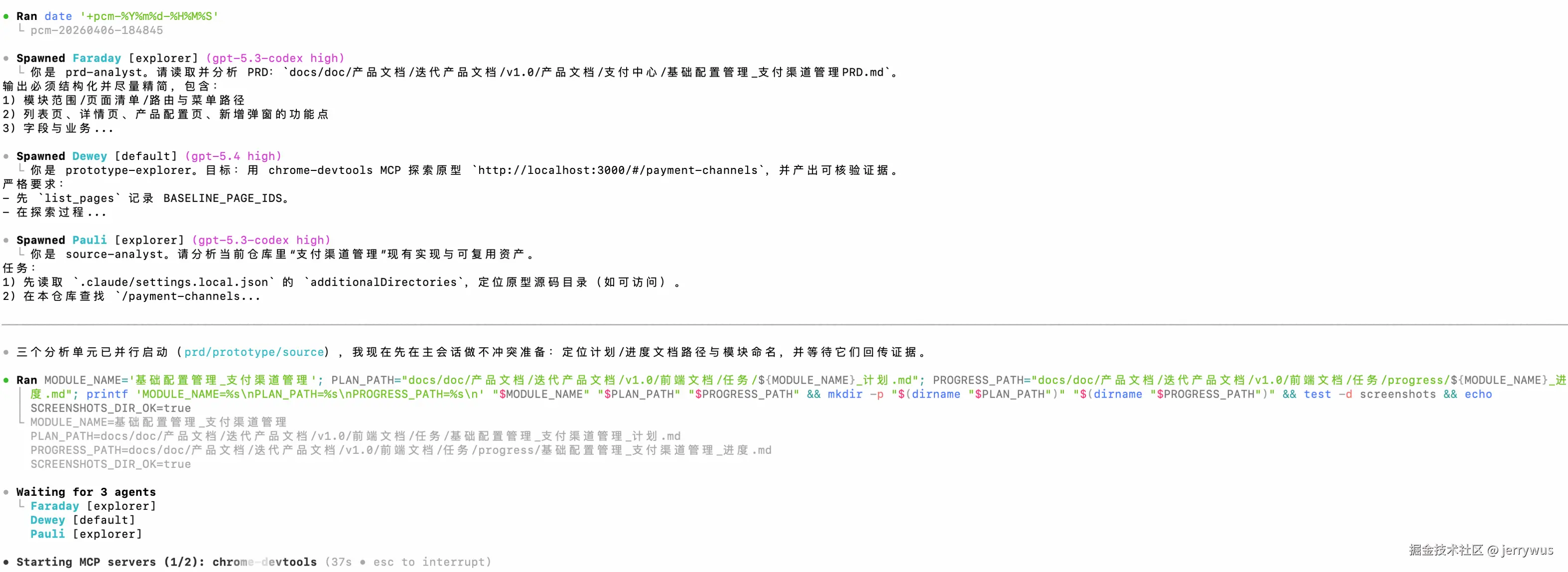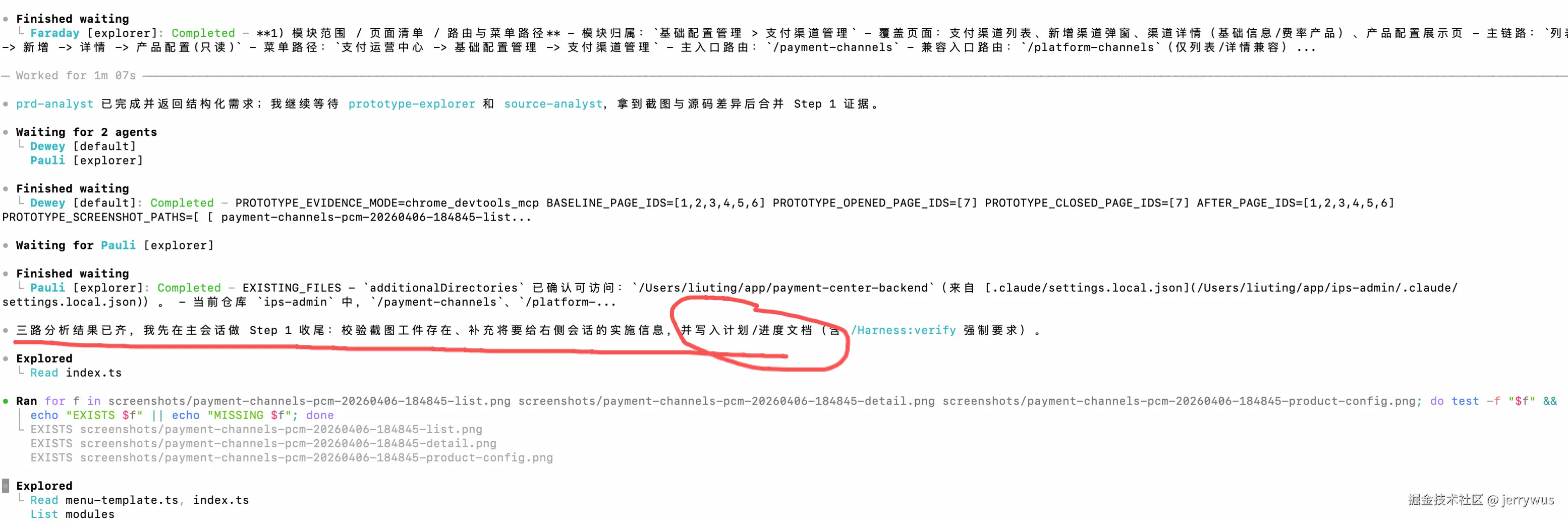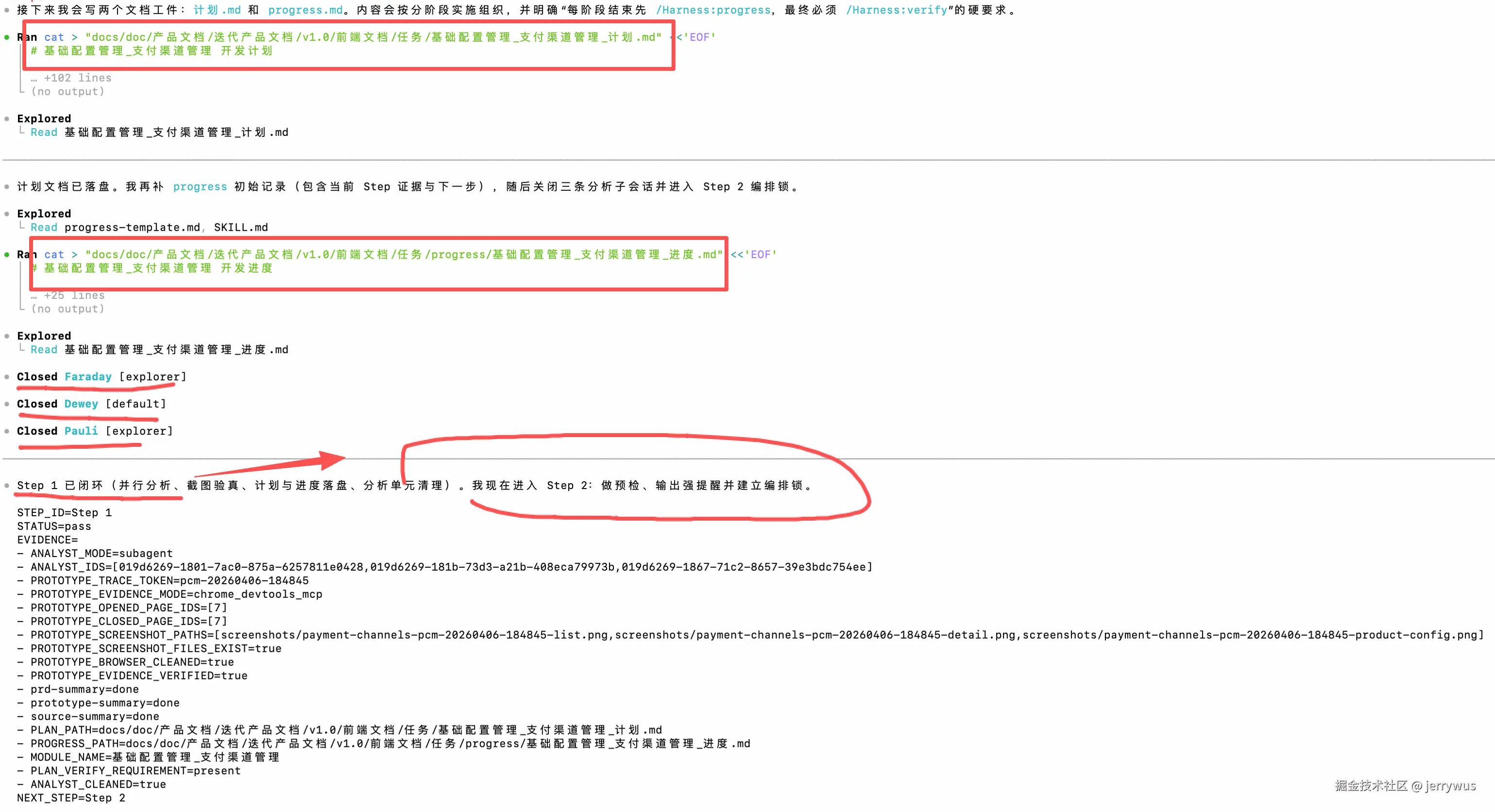 这里是我认为最值钱的一步。Harness:developer 要求并行跑 3 个分析单元: