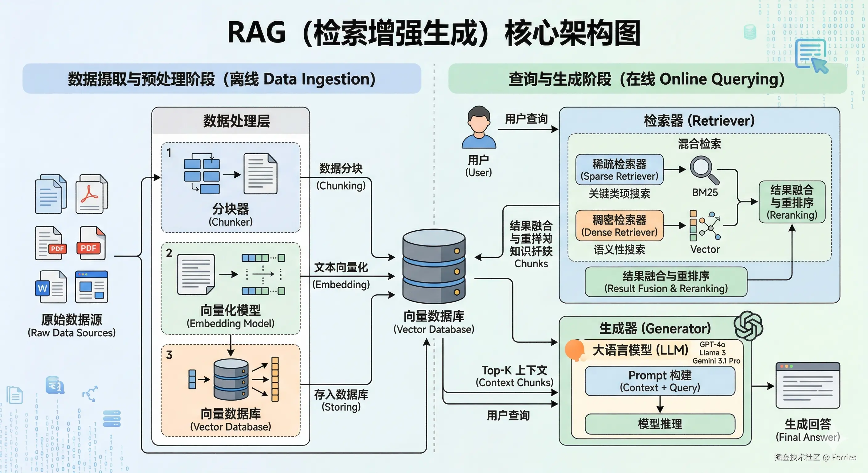 - 混合检索 (Hybrid Retrieval): 目前工业界的主流标配。它同时使用稠密和稀疏检索,把两路召回的结果汇总,再通过一个 重排序模型 (Reranker) 按照相关性重新打分排序。这种方式结合了精准度和语义泛化能力,效果最佳。