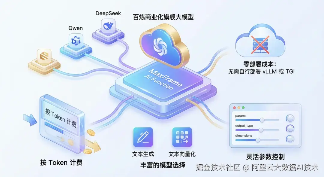 MaxFrame 内置了 AI Function 能力,预置 Qwen、DeepSeek 等开源模型,同时支持对接百炼商业化旗舰大模型,用户无需关心模型部署和推理服务: