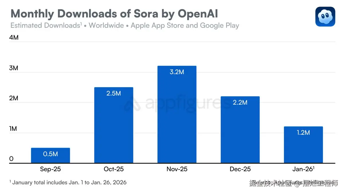 Sora 的全球用户数在冲到约 100 万后,很快掉到不足 50 万,而 留存特别低! 做产品的都知道,日活和留存是非常重要的。