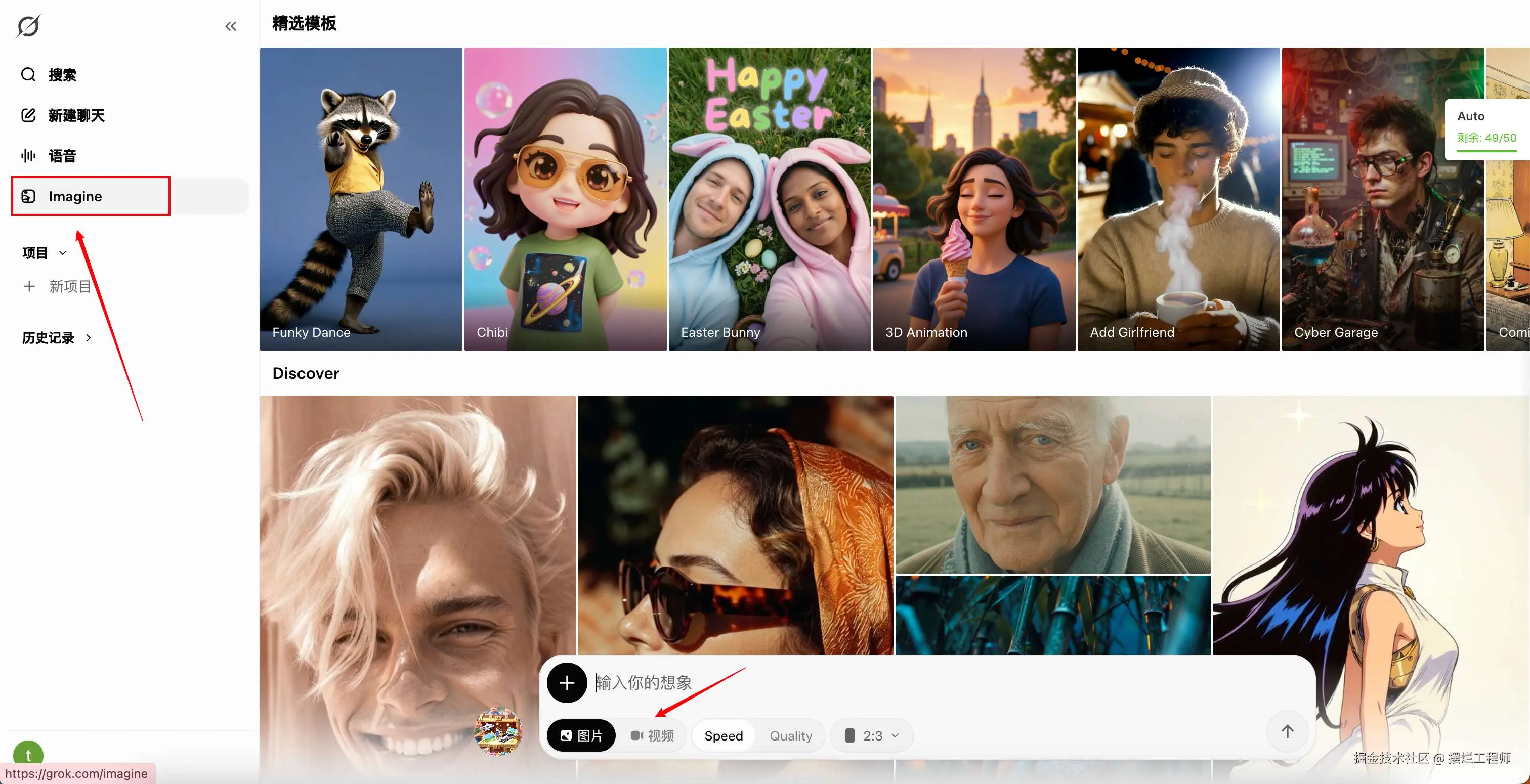 视频生成和图片生成,Grok 统一放在 Imagine 菜单上。
