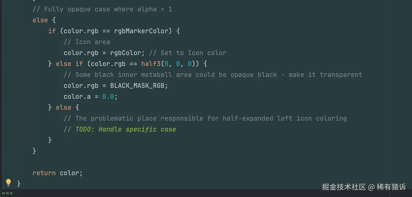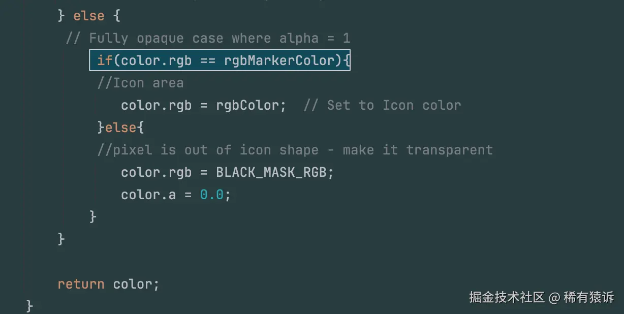 在不透明部分,检查像素的 RGB 颜色是否等于 markerColor。如果为真,则它是图标像素------你可以将其着色为任何你想要的颜色。设置 alpha = 1 是多余的,因为我们已经在不透明的 else 语句块中了。