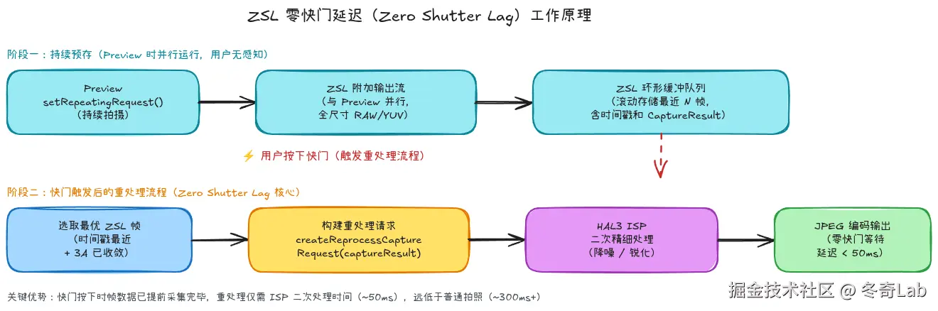 ZSL零快门延迟:通过预存环形缓冲 + Reprocessing机制,将快门延迟从300ms+压缩到50ms以内。适用于光线充足且不需要闪光的场景。