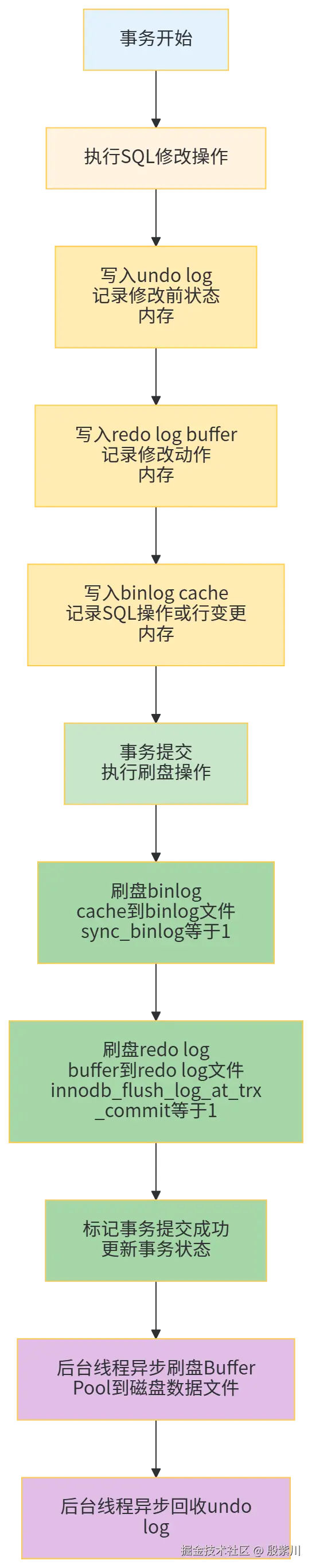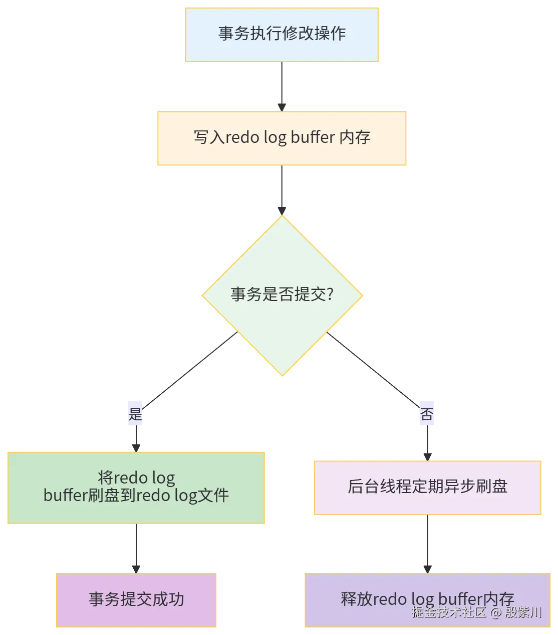 事务提交时,InnoDB 会将 redo log buffer 中的内容刷到磁盘(redo log 文件),这一步是保证事务持久性的关键。这里要注意:事务提交的"成功",是以 redo log 刷盘完成为准,而非数据刷盘完成------只要 redo log 刷盘成功,就算数据还在缓冲池、未写入磁盘,后续MySQL宕机,也能通过 redo log 恢复数据。