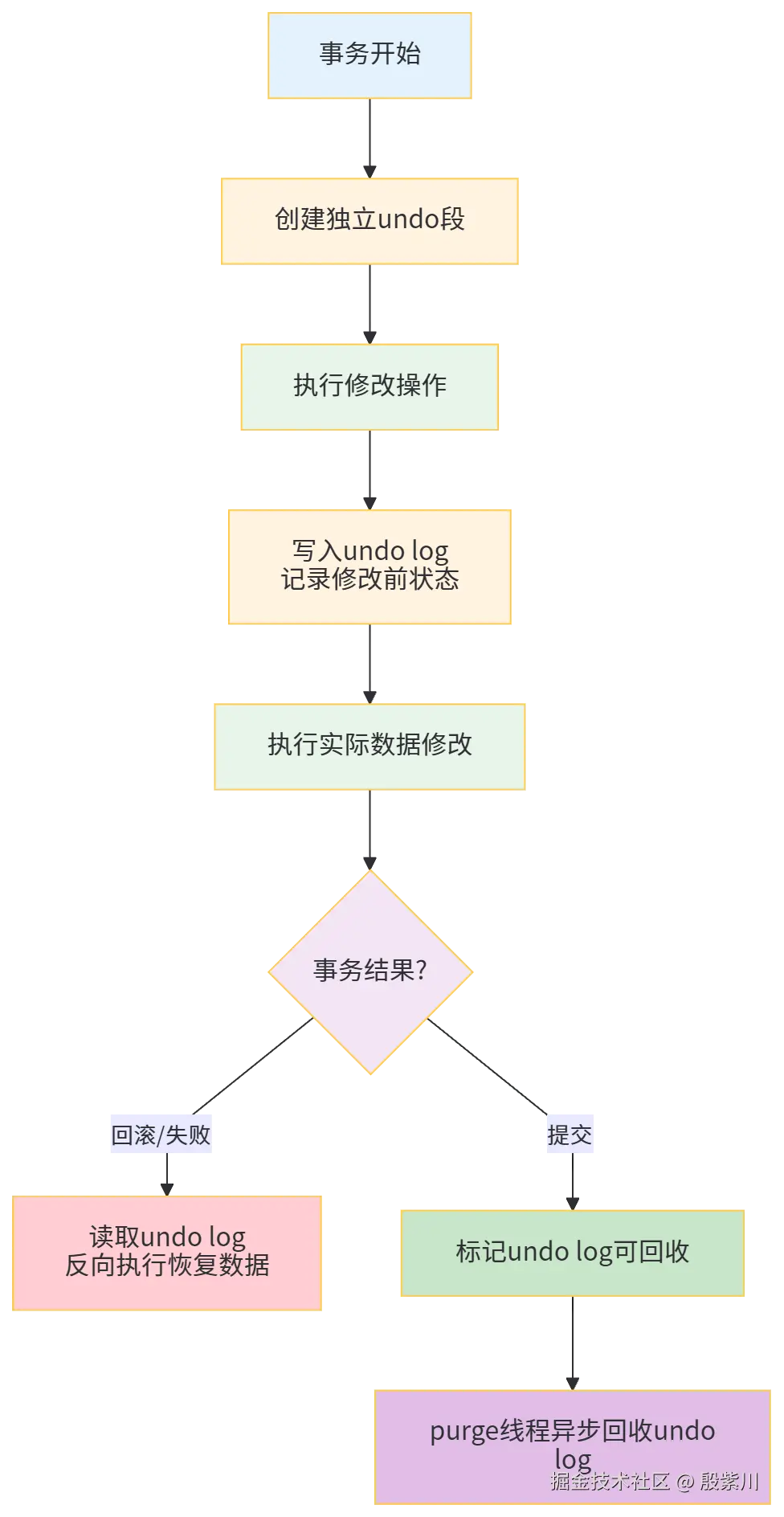 事务提交后,undo log 不会立即删除(因为可能被MVCC用于读取历史版本),而是标记为"可回收",后台的purge线程会定期扫描,将已过期(没有事务再需要读取该版本)的undo log 回收,释放存储空间。