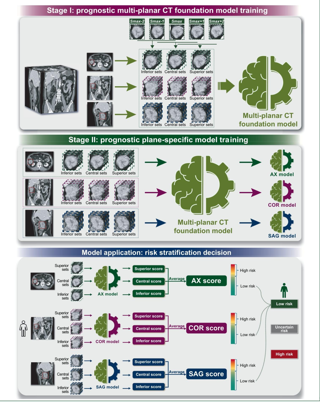 本研究旨在构建一个更为精确、个性化的风险分层系统 ,以优化二期结直肠癌患者的辅助治疗决策。具体目标包括:首先 ,开发一个基于术前多平面CT影像的深度学习分类器------STAR-CRC (Swin Transformer Assisted Risk-stratification for CRC),该模型通过训练多平面CT基础模型并进行平面特异性微调,能够将患者分为低风险、不确定风险和高风险 三类;其次 ,针对STAR-CRC中分类为"不确定风险"的患者群体,进一步结合指南推荐的病理标志物(包括pT4分期、淋巴结采样数≤12、神经周围侵犯和淋巴血管侵犯 ),构建一个复合评分,从而实现对这一亚组的再分层;最终 ,将影像分类结果与病理评分整合,形成一个四层风险分层系统------IRIS-CRC (Intelligent Risk Integration System for Stage II Colorectal Cancer),将患者分为良好、中等、不良和极差预后组。该系统旨在显著提高风险分层的判别能力与临床适用性 ,力求准确识别那些可安全避免辅助化疗的低风险患者,同时甄别出需接受更积极治疗的高风险人群,从而在保证疗效的前提下减少不必要的治疗相关毒性,推动二期结直肠癌的精准医疗进程。