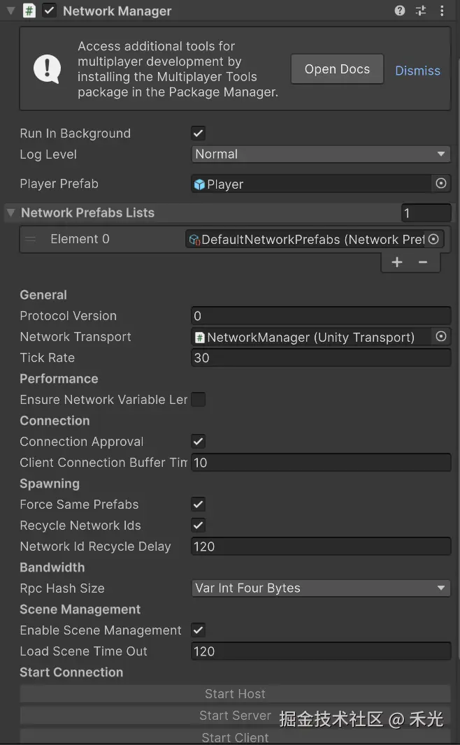 | Player Prefab | 玩家预制体,客户端连接时服务器自动生成 | 预制体必须挂载 NetworkObject 组件 ,否则无法生成。建议同时挂载 NetworkTransform(位置同步)和 NetworkAnimator(动画同步)。 |