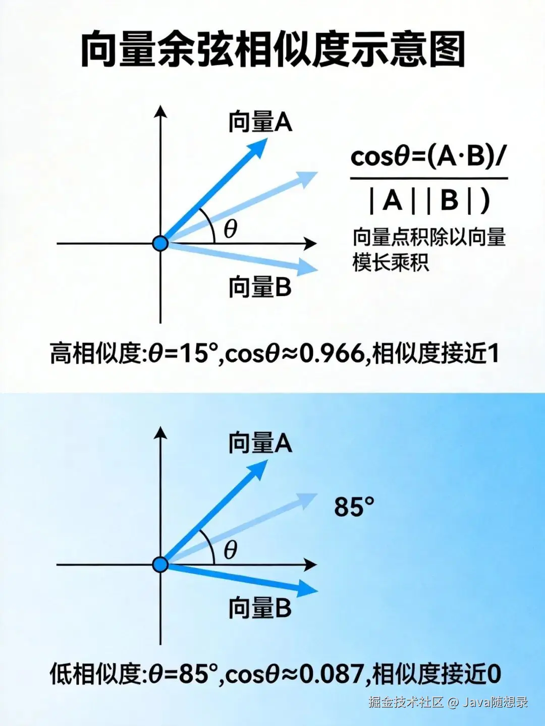 余弦相似度关注向量的方向,不是长度。在自然语言里,概念的相似性更多体现在"方向"上。