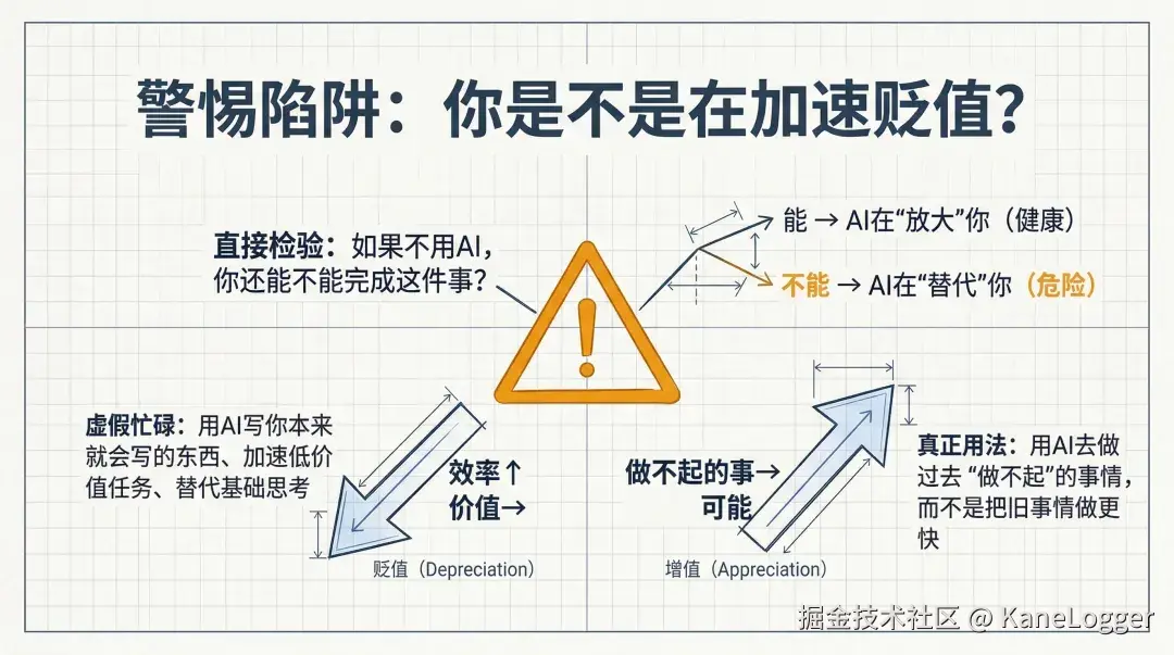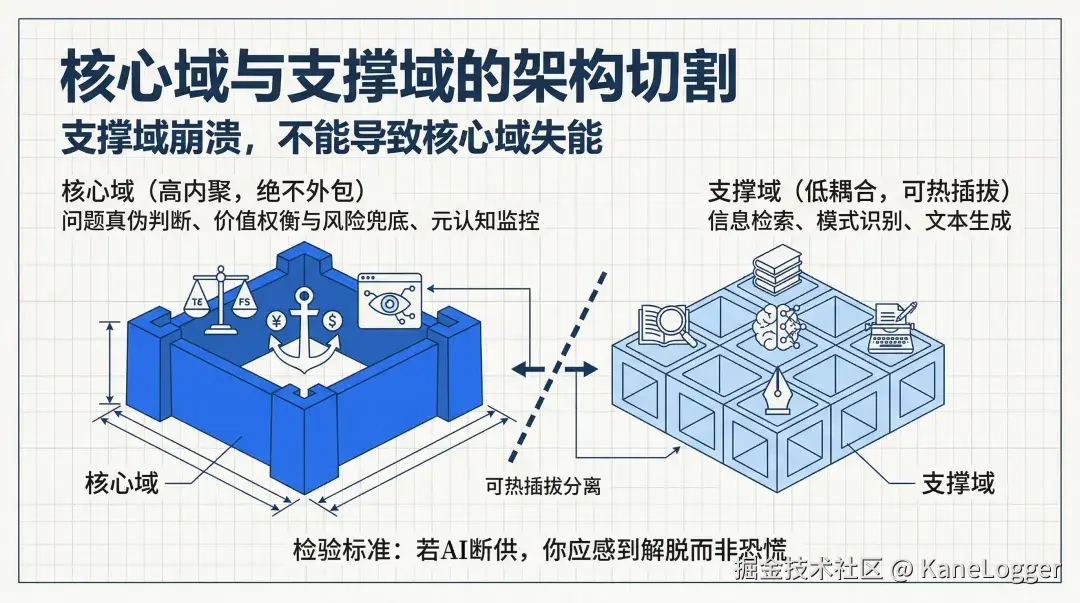 关键界限:支撑域的崩溃不能导致核心域失能。若AI断供,你应感到解脱而非恐慌。护城河不在AI本身,而在你的领域专业知识与AI自动化能力的乘积。