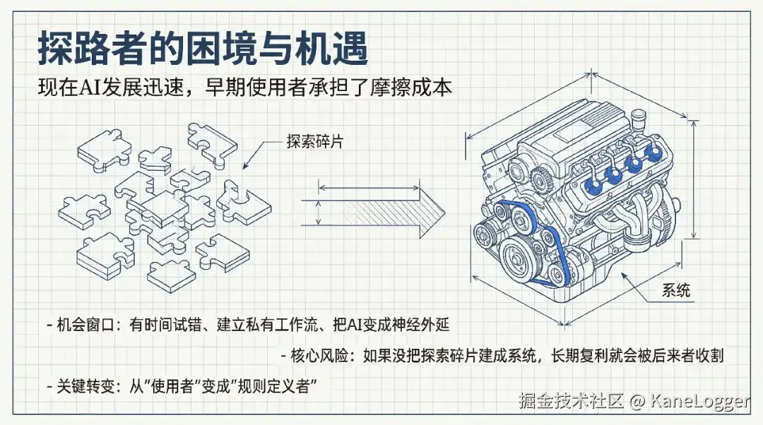 先行者的关键分化点就在这里:当别人还在学习"如何使用AI产品"时,你已经建立了自己的私有工作流。等AI普及为基础设施,你已经是规则的定义者,而后来者只能在你的规则里做最优选择。