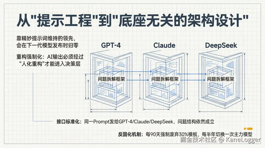 - 接口标准化:问题拆解框架必须与模型无关(测试:把同一prompt发给GPT-4/Claude/DeepSeek,你的问题结构是否依然成立?)