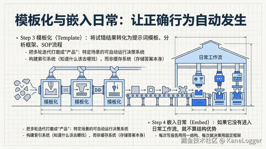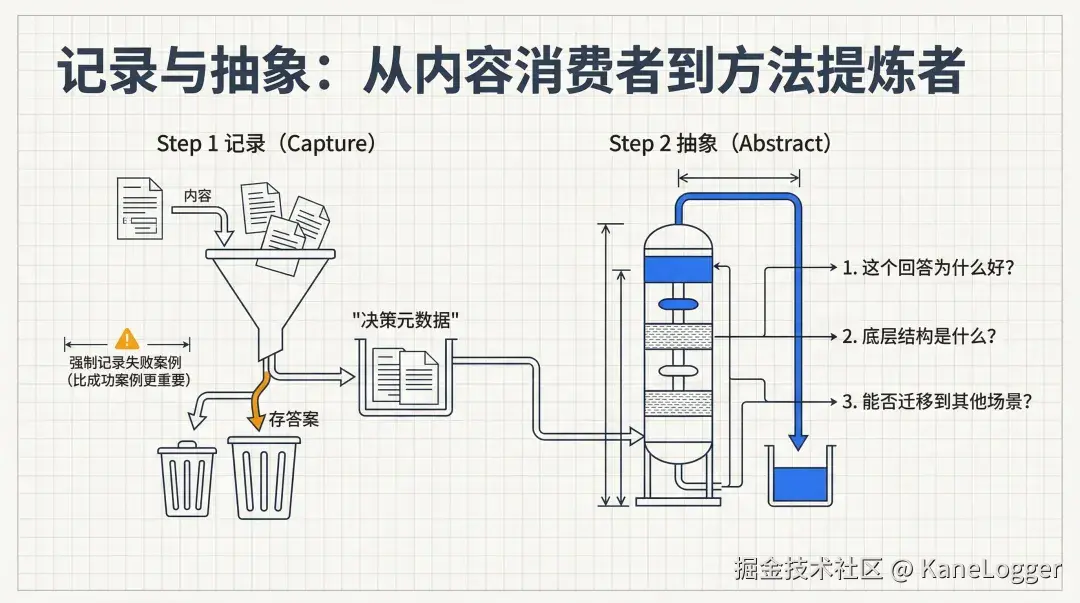 记录有效回答、失败案例(更重要)和高质量Prompt。积累"决策元数据"而非"答案"------记录"为什么这个prompt有效"(逻辑结构),而非保存"这个回答内容好"(具体信息)。