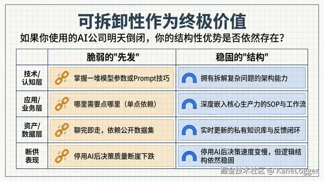 结构的价值在于可拆卸性。终极检验:如果你现在使用的AI公司明天倒闭,你的"结构性优势"是否依然存在?