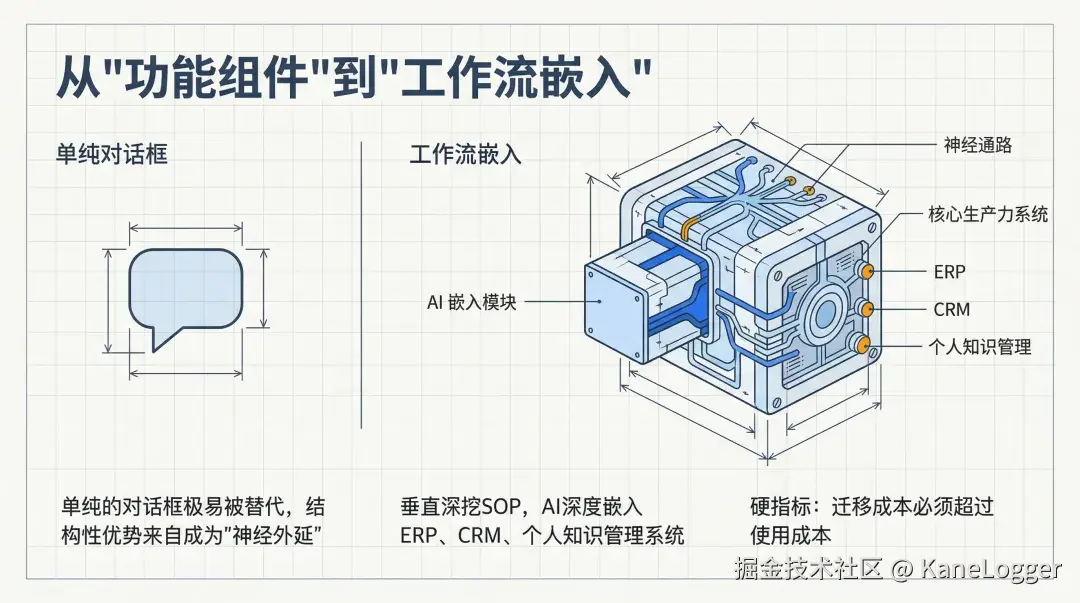- 将AI从"对话框"迁移至核心生产力系统的嵌入层(ERP/CRM/个人知识管理)