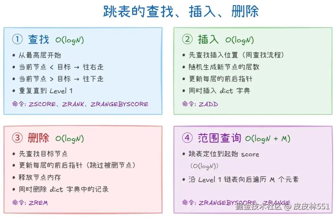 ZSCORE、ZRANK等命令的基础。 - 插入:先找到插入位置,然后随机生成新节点层数,更新每层的前后指针。同时往字典中插入一条记录。时间复杂度 O(logN)。